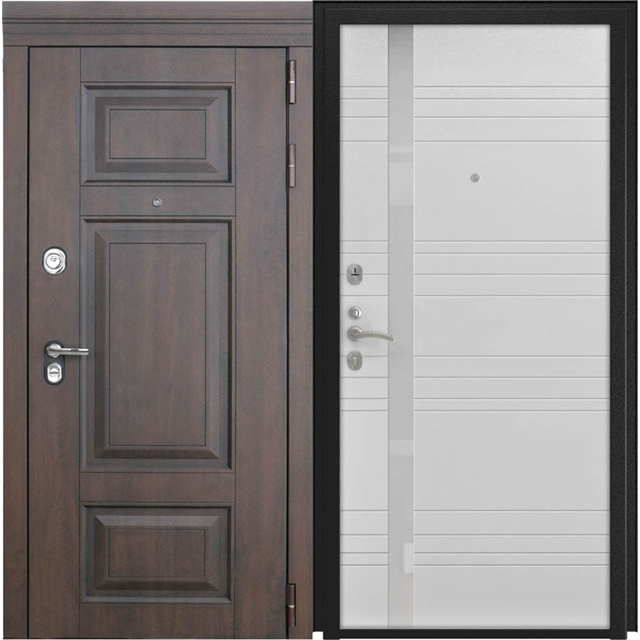 3 контура уплотнения, 3 петли, рёбра жесткости, 2 противосъемных штыря, ключ-вертушка, ночная задвижка, врезная броненакладка, короб закрытый утепленный |